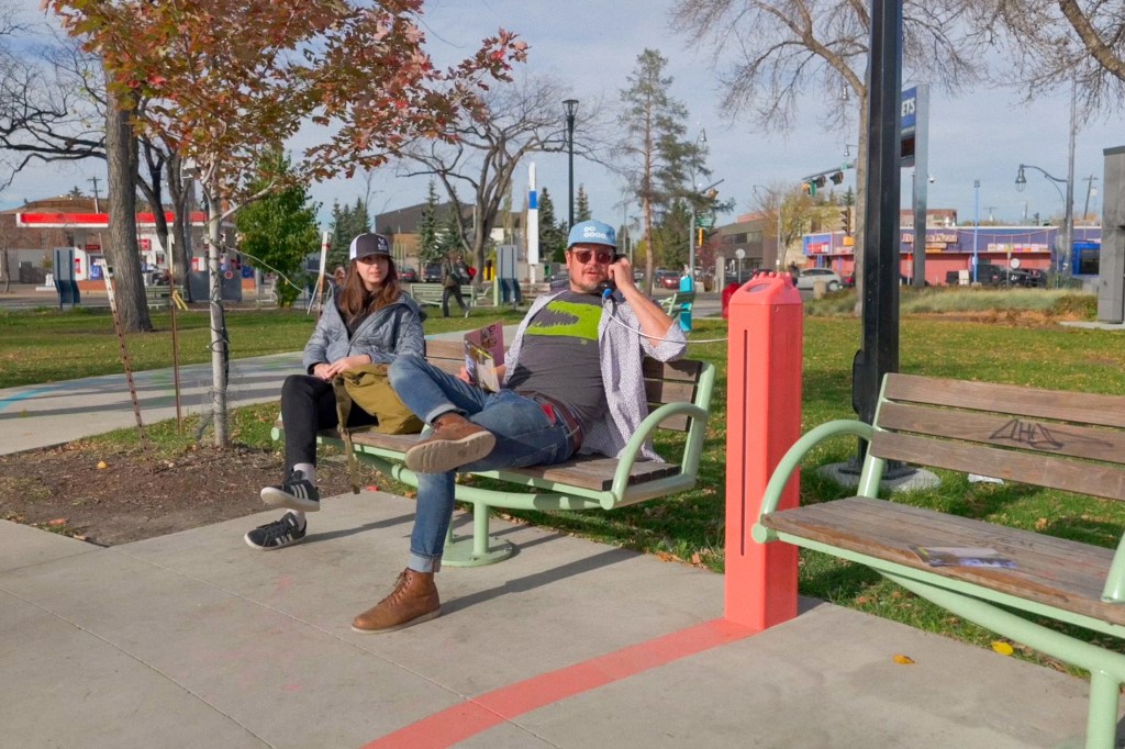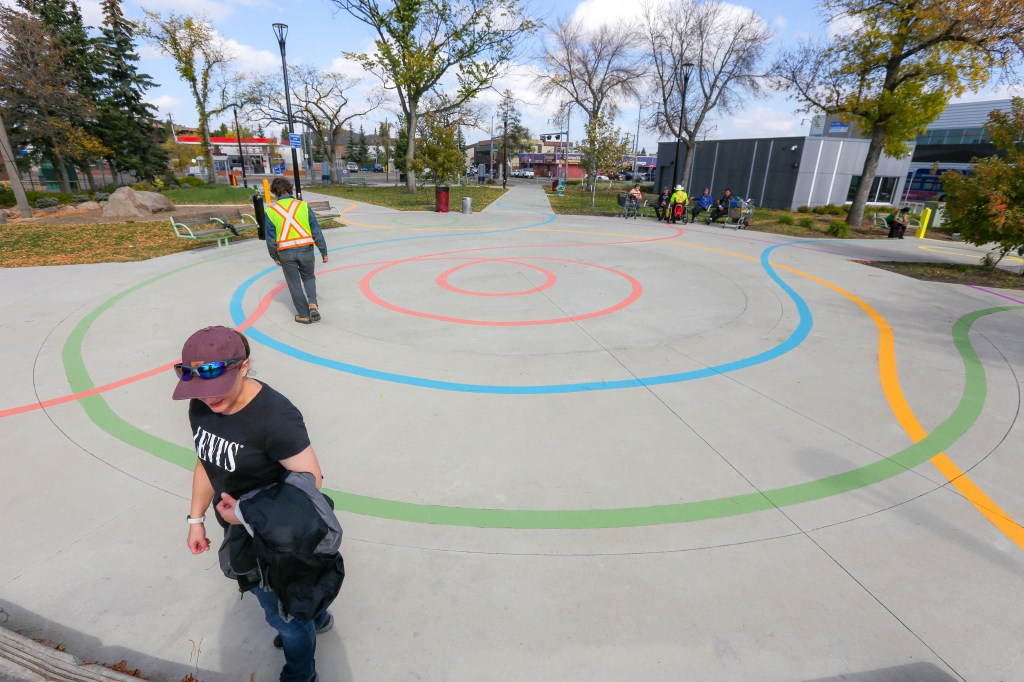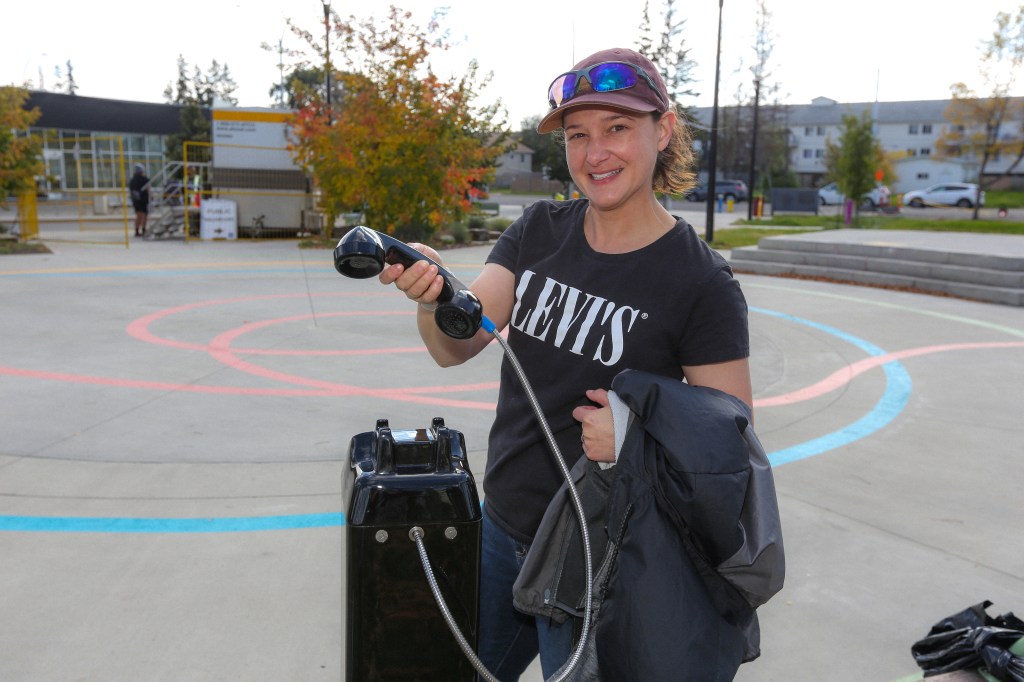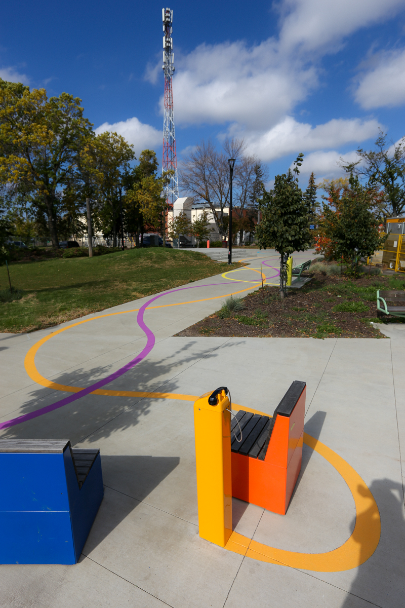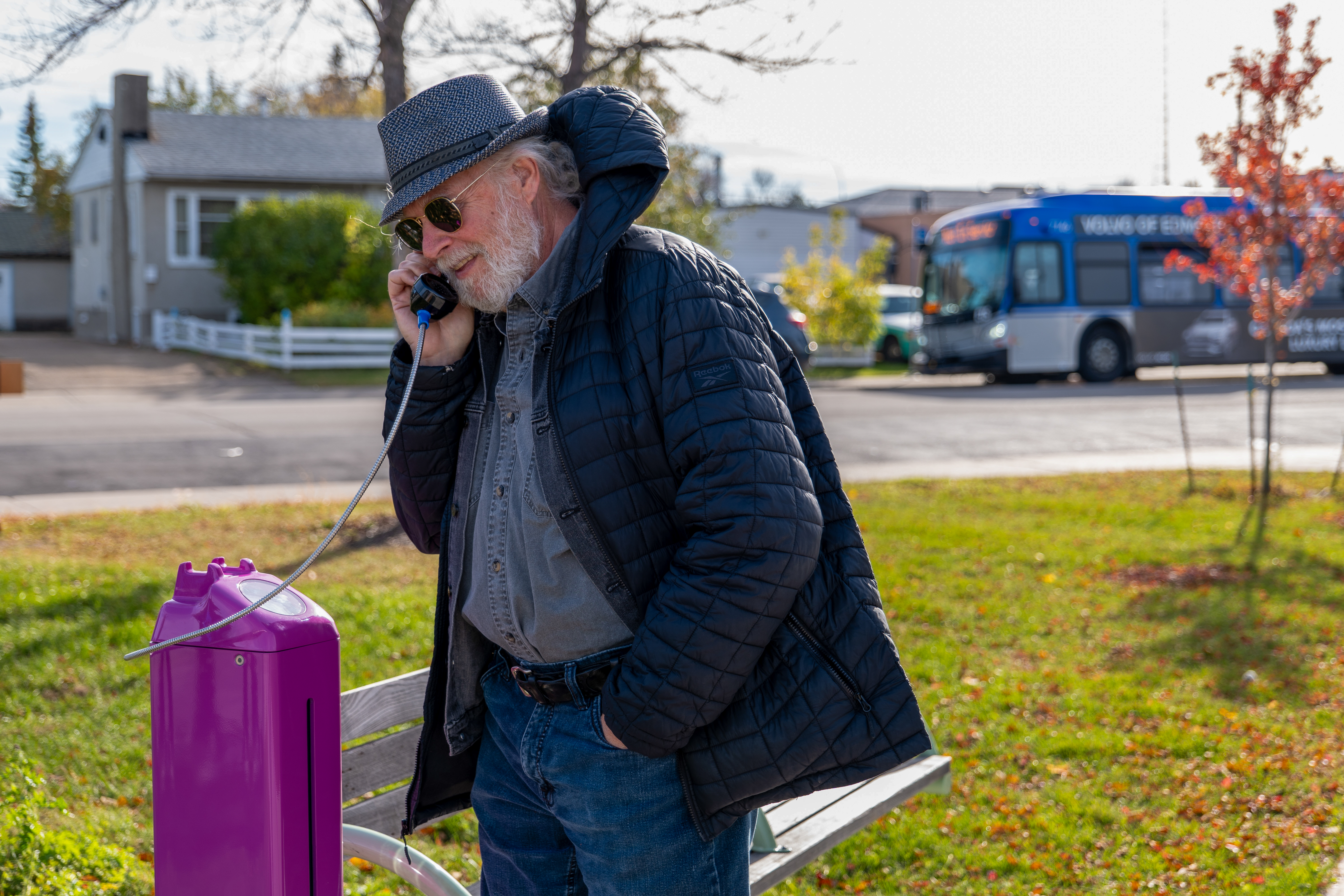 13 brightly coloured telephone pillars are placed throughout Butler Memorial Park in Edmonton/Treaty 6. Each pair of colour-coded telephones is connected by looping ‘landlines’ curling underfoot.